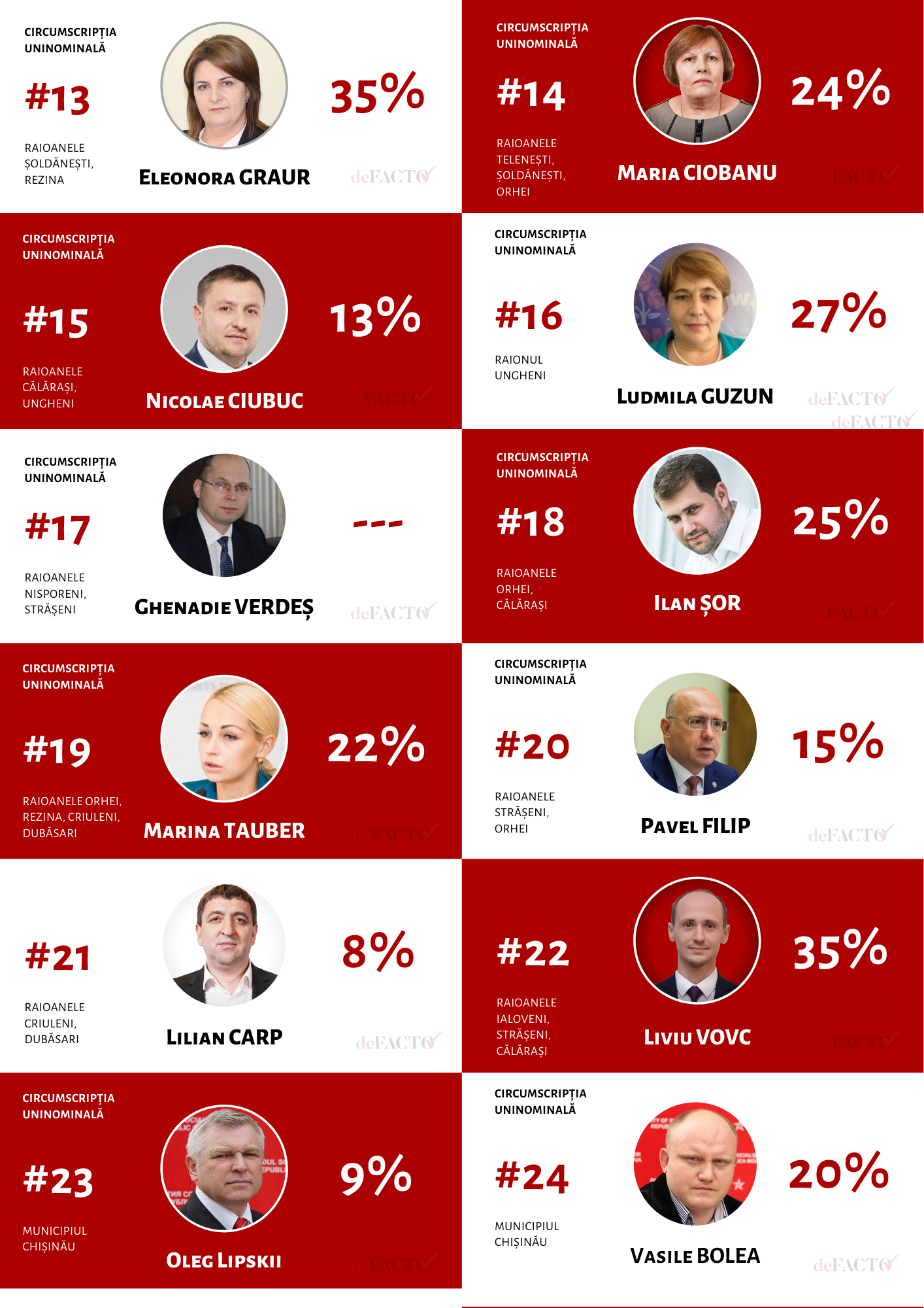De notat că cei mai cunoscuți deputați din circumscripțiile uninominale care au acumulat un scor de 35% de recunoaștere sunt: Aliona Pilipețcaia (PSRM), Eleonora Graur (PDM), Liviu Vovc (Blocul ACUM), Ion Groza (independent). Președinta Parlamentului, Zinainda Greceanîi (PSRM), a acumulat un scor de doar 11%.