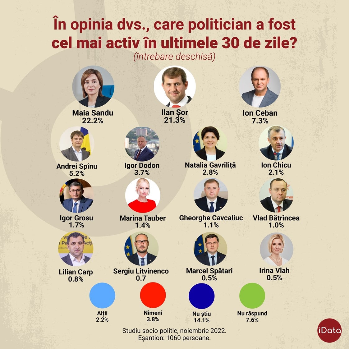 Președintele Maia Sandu și liderul opoziției, Ilan Șor, sunt cei activi politicieni, arată datele sondajului realizat de compania iData lunar și prezentate astăzi. Potrivit cercetării, diferența dintre cei doi politicieni este de mai puțin de un punct procentual.