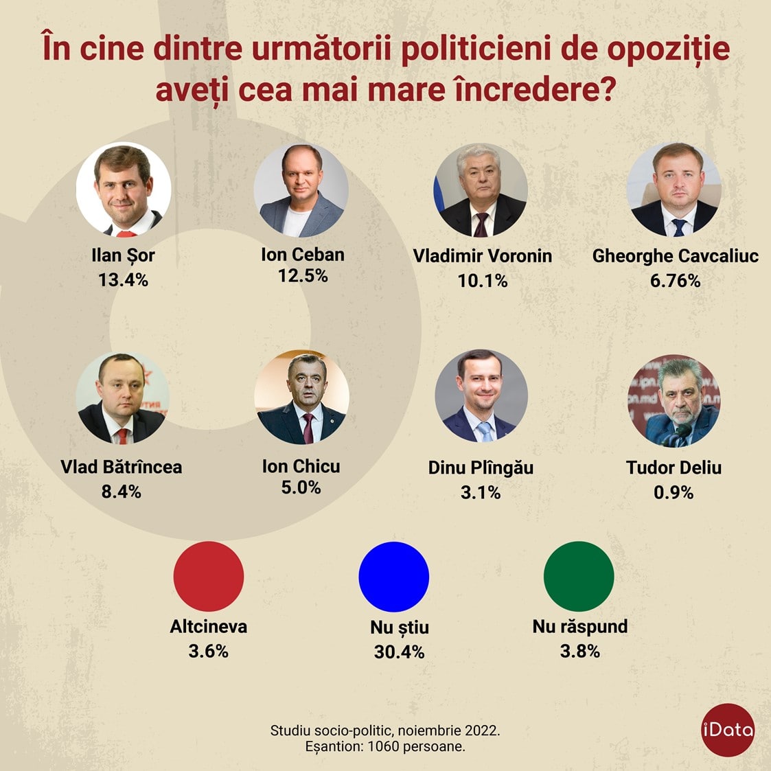 Întrebați în care dintre politicienii de opoziție au cea mai mare încredere, cei mai mulți dintre cei intervievați l-au menționat pe Ilan Șor. El a întrunit 13,4 la sută din răspunsuri, urmat de primarul capitalei, Ion Ceban, cu un scor de 12,5 la sută, și președintele PCRM, Vladimir Voronin, cu 10,1 la sută.