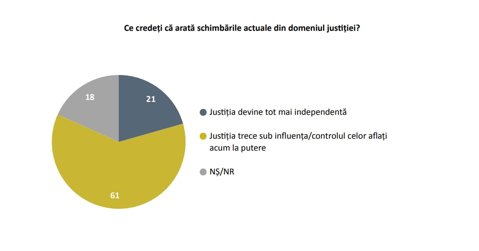 Fiind întrebați ce cred că arată schimbările actuale din justiție, 61 la sută din persoanele chestionate au răspuns că justiția trece sub control celor aflați la putere. În același timp, 21% cred că justiția devine independentă, iar 18% nu au putut formula un răspuns.