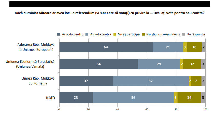 Înce privește aderarea R.Moldova la NATO, „Pro” ar vota 23%, în timp ce împotrivă – 56%.