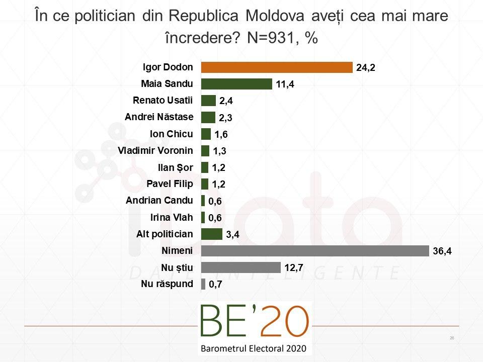 Astfel, politicienii în care respondenții au cea mai mare încredere sunt: Igor Dodon (24,2%) și Maia Sandu (11,4%), iar 36,4 % din respondenți nu au încredere în nimeni.