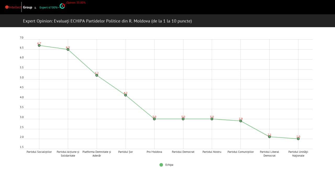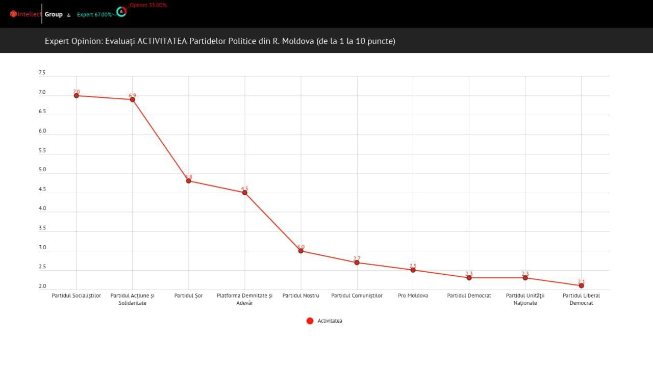 Totodată, experții consideră că cel mai activ partid politic din republica Moldova este PSRM, urmat de PAS și PP „Șor”. Socialiștii au obținut cea mai mare notă și la capitolul profesionalismul echipei. PSRM – 6,7, urmat de PAS – 6,5 și Platforma DA – 5,2.