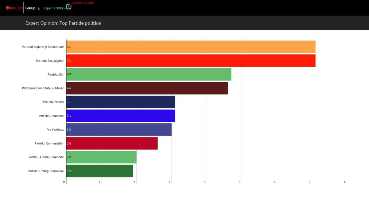 Experții, care au participat la studiu, au fost rugați să facă un top al formațiunilor politice din țara noastră, notându-le de la 1 la 10. PSRM și PAS au obținut cea mai mare notă, 7,1.