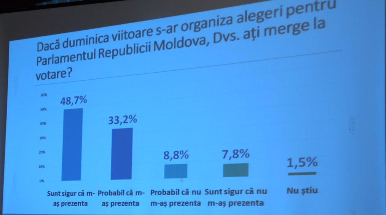 Astfel, dacă duminica viitoare s-ar oganiza alegeri pentru Parlamentul Republicii Moldova, 48.7% dintre moldoveni cu siguranță s-ar prezenta la urne. 33.2% spun că probabil ar veni, în timp ce 8.8% spun că probabil nu s-ar prezenta. Totodată, doar 7.8% au recunoscut că nu vor veni cu siguranță la vot, iar 1.5% încă nu știu sau nu au dorit să răspundă.