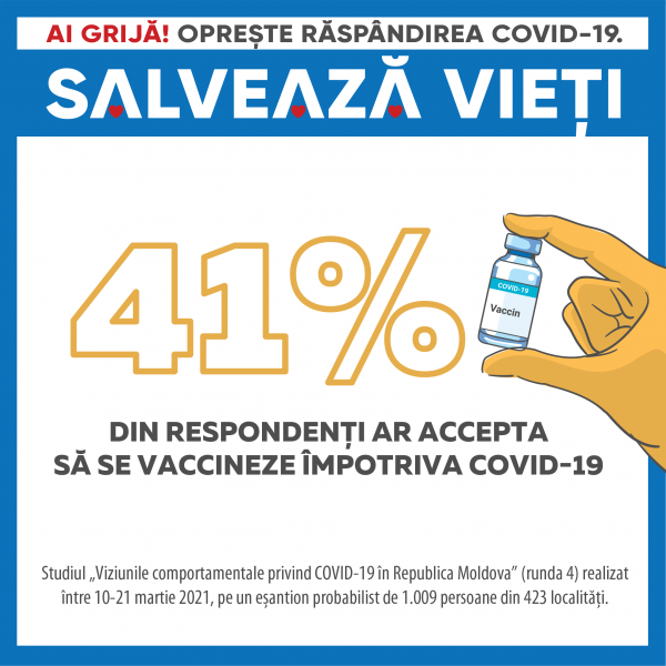Acceptarea vaccinului împotriva COVID-19 a crescut semnificativ: 41% ar accepta să se vaccineze, comparativ cu 31% în studiile anterioare. Totodată, a scăzut cu 9% (de la 46% la 37%) procentul persoanelor care afirmă că nu se vor vaccina cu siguranță. La general, vaccinul este acceptat mai mult de către persoane în vârstă și bărbați, cei cu încredere mai mare în autorități și cei care percep virusul ca fiind aproape și că se răspândește rapid.
