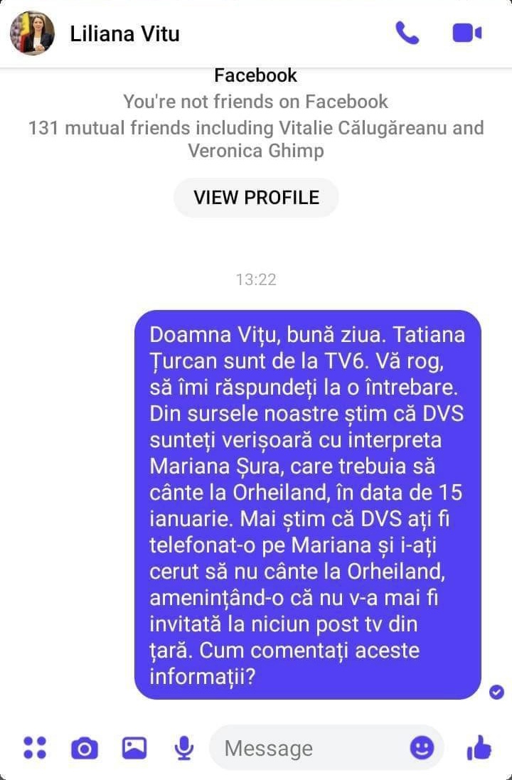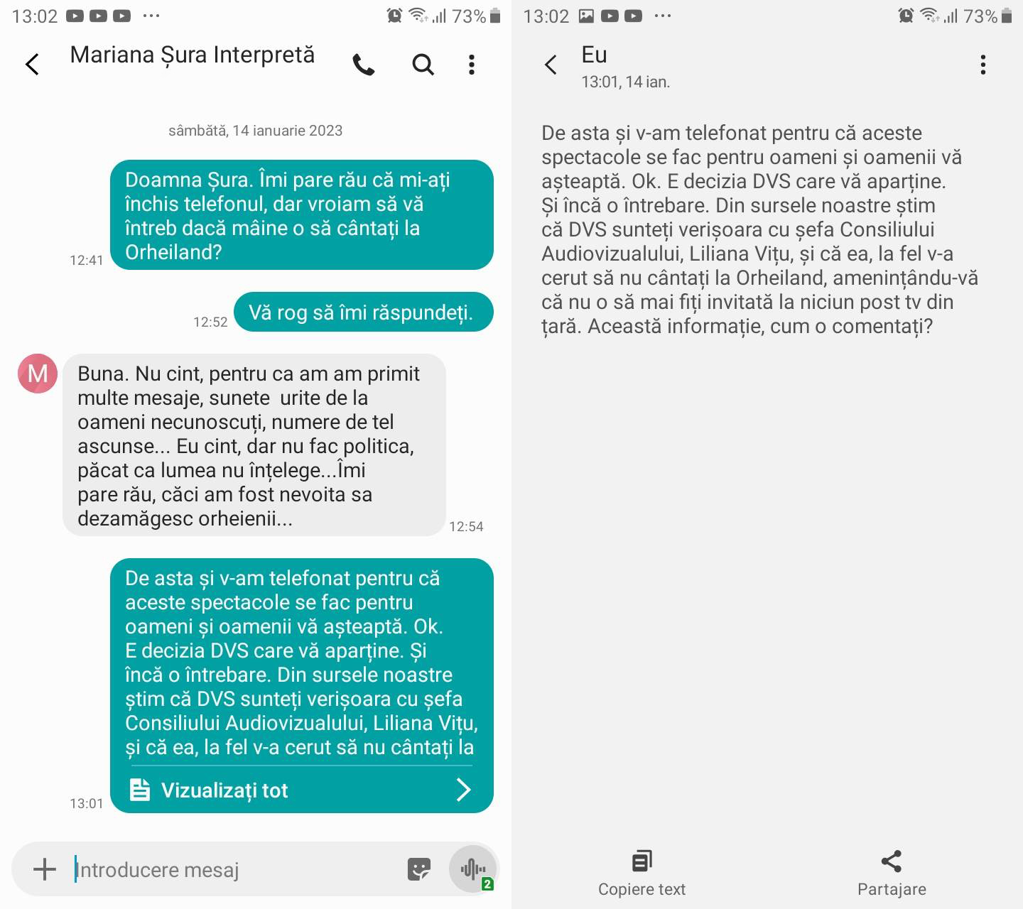Mai târziu, și interpreta Mariana Șura a refuzat să participe la concertul de la Orheiland, din 15 ianuarie. Potrivit surselor TV6, ea ar fi primit apeluri cu amenințări de la ruda sa, președintele CA, Liliana Vițu, precum și de alți reprezentanți ai autorităților. Artista ar fi fost amenințată că va fi interzisă la toate posturile TV din țară, dar și la alte evenimente. Jurnaliștii TV6, nu au reușit să discute la telefon cu Vițu, pentru a obține un comentariu la subiect. Ea nu a răspuns nici la mesajele jurnaliștilor.