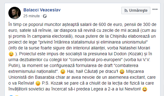 Balacci spune că proiectul dat, este impus de socialiști la presiunea lui Dodon, care la rândul său, a primit astfel de instrucțiuni de la vicepremierul rus, Dmitrii Kozak, care a avut un cuvânt greu de spus în formarea majorității parlamentare.