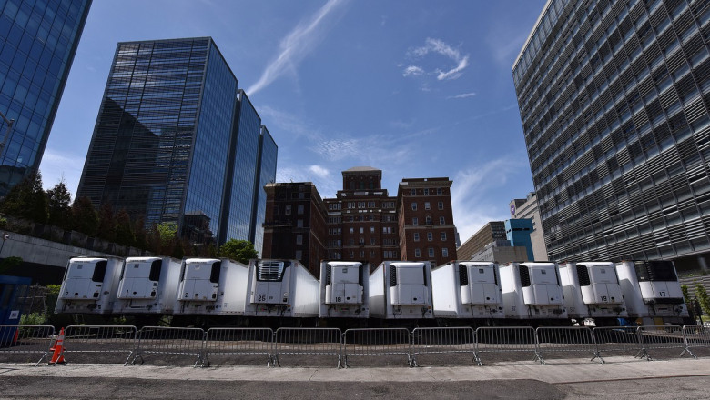 Camioane frigorifice sunt parcate lângă morga înfiinţată, în aprilie, după ce a izbucnit pandemia în Statele Unite. Autorităţile oraşului New York spun că toată această situație este o tragedie şi promit că vor rezolva această problemă.