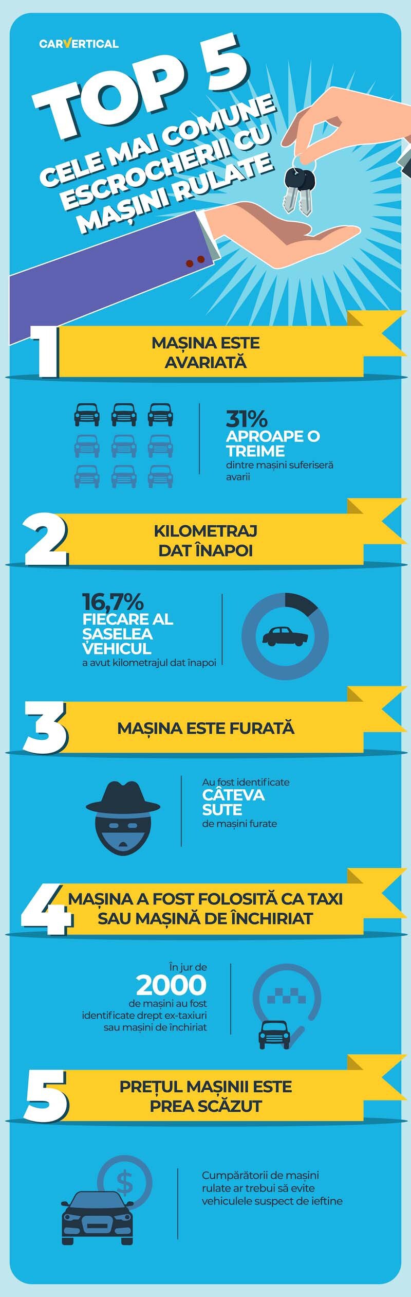 CarVertical a efectuat o cercetare a celor mai frecvente escrocherii cu mașini rulate. Platforma de rapoarte ale istoricului auto carVertical adună o mulțime de informații despre mașini din registre naționale și private, din diverse baze de date aparținând companiilor de asigurări plus baze de date privind vehiculele furate din multe țări europene, SUA, Canada si Rusia. Toate aceste surse au fost utilizate pentru întocmirea studiului, care s-a desfășurat din aprilie 2020 până în aprilie 2021.