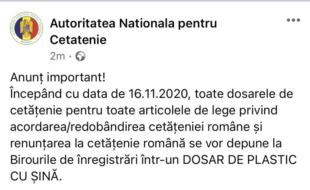 Începând cu data de 16.11.2020, toate dosarele de cetățenie pentru toate articolele de lege privind acordarea/redobândirea cetățeniei române și renunțarea la cetățenie română se vor depune la Birourile de înregistrări într-un DOSAR DE PLASTIC CU ȘINĂ, anunță Autoritatea Națională pentru Cetățenie din România.