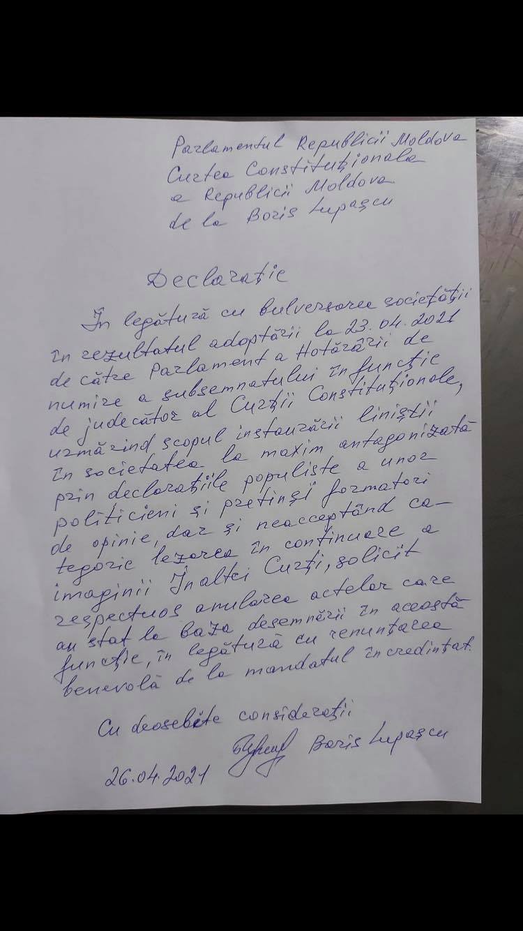„În legătură cu bulversarea societății în rezultatul adoptării la 23.04.2021 de către Parlament a Hotărârii de numire a subsemnatului în funcția de judecător al Curții Constituționale, urmărind scopul instaurării liniștii în societatea la maxim antagonistă prin declarațiile populiste ale unor politicieni și pretinși formatori de opinie, rog respectuos anularrea actelor care au stat la baza desemnării în această funcție”.