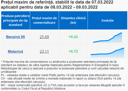 Astfel, un litru de benzină va costa 25.69 de lei, cu 43 de bani mai mult. Un litru de motorină va costa 23.11 lei, cu 72 de bani mai mult.