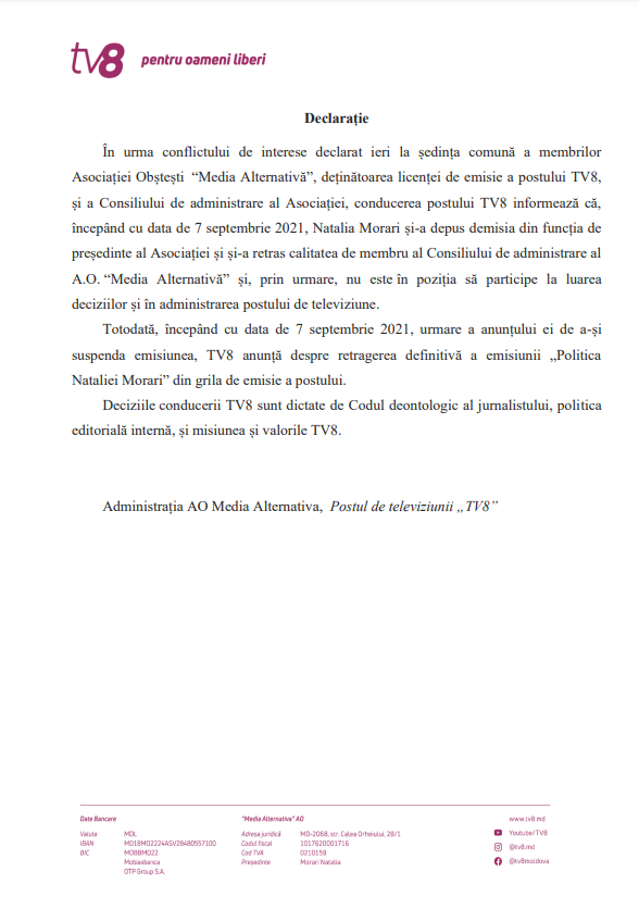 În urma conflictului de interese declarat ieri la ședința comună a membrilor Asociației Obștești “Media Alternativă”, deținătoarea licenței de emisie a postului TV8, și a Consiliului de administrare al Asociației, conducerea postului TV8 informează că, începând cu data de 7 septembrie 2021, Natalia Morari și-a depus demisia din funcția de președinte al Asociației și și-a retras calitatea de membru al Consiliului de administrare al A.O. “Media Alternativă” și, prin urmare, nu este în poziția să participe la luarea deciziilor și în administrarea postului de televiziune.