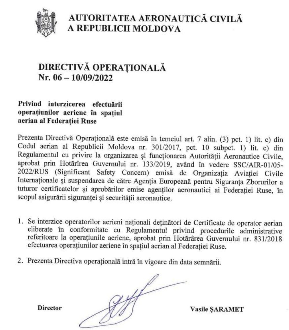 “Autoritatea Aeronautică Civilă a Republicii Moldova, în scopul asigurării siguranței și securității aeronautice, având în vedere SSC/AIR-01/05-2022/RUS (Signifiant Safety Concern) emisă de Organizația Aviației Civile Internaționale, precum și decizia de suspendarea de către Agenția Europeană pentru Siguranța Zborurilor a tuturor certificatelor și aprobărilor emise agenților aeronautici ai Federației Ruse că, la 10 septembrie 2022 a emis Directiva Operațională nr. 06 – 10/09/2022, prin care se interzice efectuarea operațiunilor aeriene în spațiul aerian al Federației Ruse de către operatorii aerieni naționali”, a anunțat Spînu.