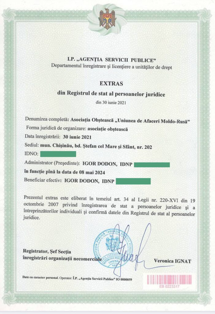 ULTIMA ORĂ // Igor Dodon publică dovada că este președintele AO ”Uniunea de Afaceri Moldo-Rusă”