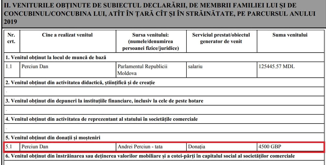 Peste un an, în declarația pentru 2019, depusă deja în calitate de parlamentar, Dan Perciun a indicat că a primit de la tatăl său 4500 de lire sterline, adică 110 250 de lei.