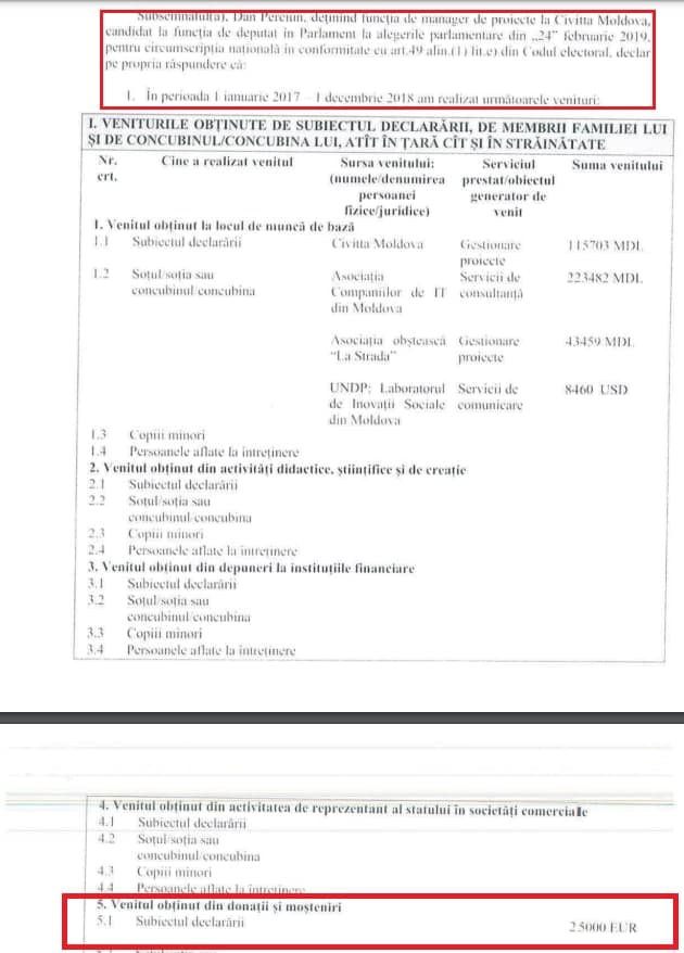 Astfel, în declarația de avere și interese personale, pe care Dan Perciun a depus-o în 2018, când era candidat la alegeri parlamentare, acesta a declarat că a primit o donație de 25 de mii de euro, echivalentul a jumătate de milion de lei. Perciun nu a indicat în document cine i-a oferit acest sprijin financiar generos.