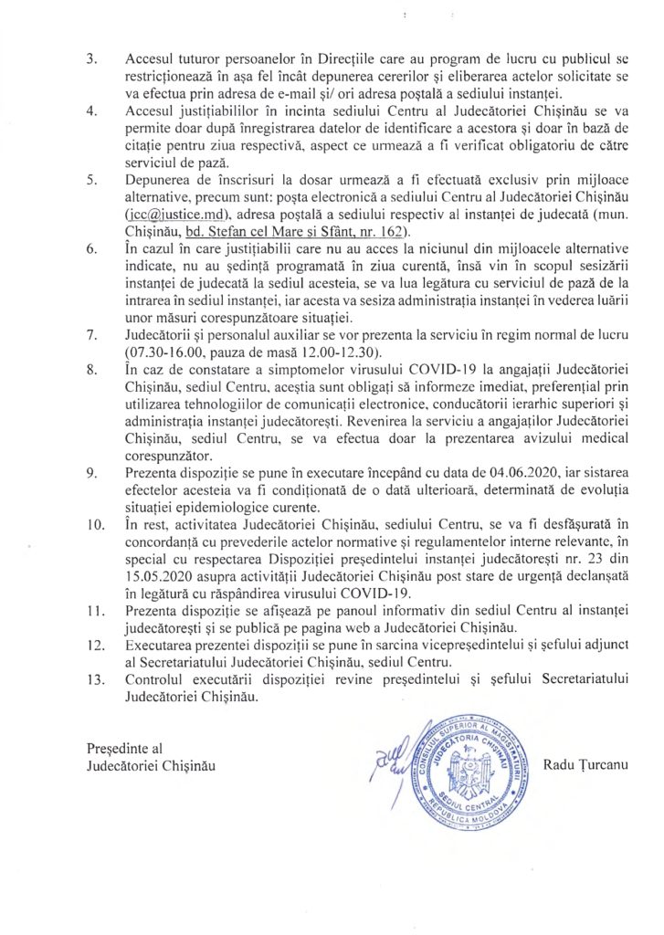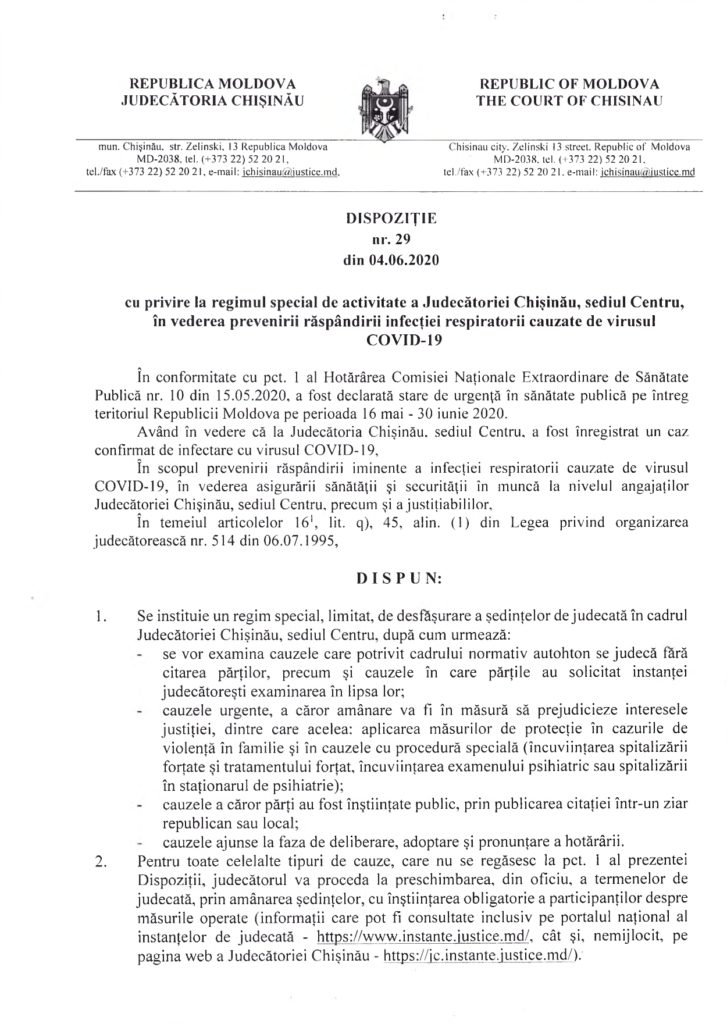 În acest sens, a fost adus cunoștința publică prevederile Dispoziției președintelui Judecătoriei Chișinău nr. 29 din 04.06.2020, cu privire la regimul special de activitate al Judecătoriei Chișinău, sediul Centru, în vederea prevenirii răspândirii infecției respiratorii cauzate de virusul COVID-19.