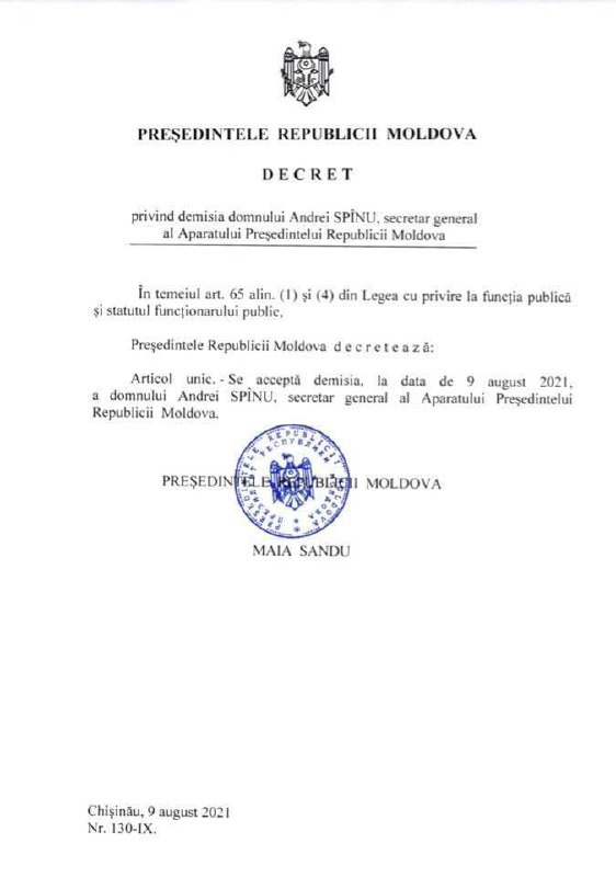 Președintele Maia Sandu a semnat decretul cu privire la demisia lui Andrei Spînu din funcția de secretar general al Aparatului președintelui Republicii Moldova.
