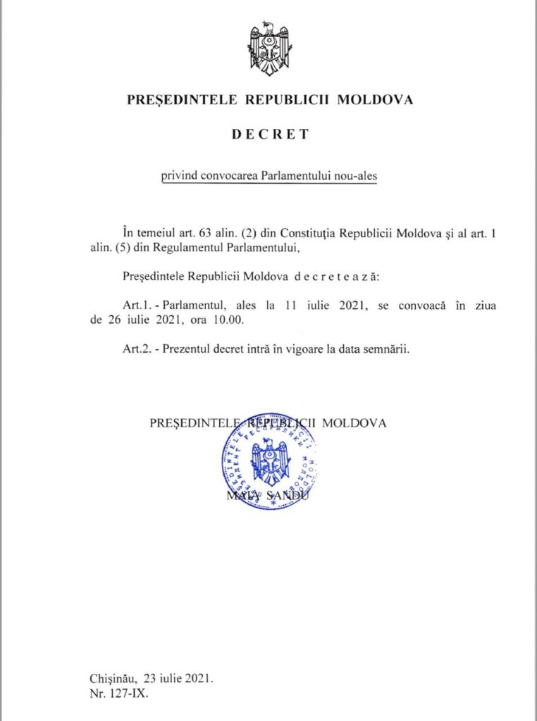 Președintele Republicii Moldova, Maia Sandu, a semnat astăzi Decretul de convocare a Parlamentului Republicii Moldova de Legislatura a XI-ea. Prima ședință a noului Legislativ va avea loc luni, 26 iulie, începând cu ora 10.00.