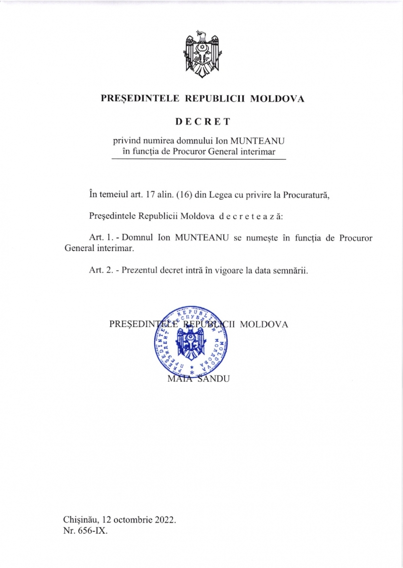 Președintele Republicii Moldova, Maia Sandu, a semnat astăzi decretul prin care l-a numit pe Ion Munteanu, procuror în cadrul Procuraturii Anticorupție, în funcția de Procuror General interimar.