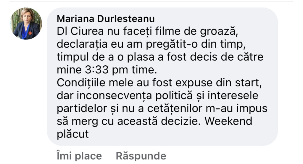 “Declarația eu am pregătit-o din timp, timpul de a o plasa a fost decis de către mine 3:33 pm time”, a comentat Durleșteanu la postare unui politolog, confirmând că a avut pregătit din timp textul pentru retragere.