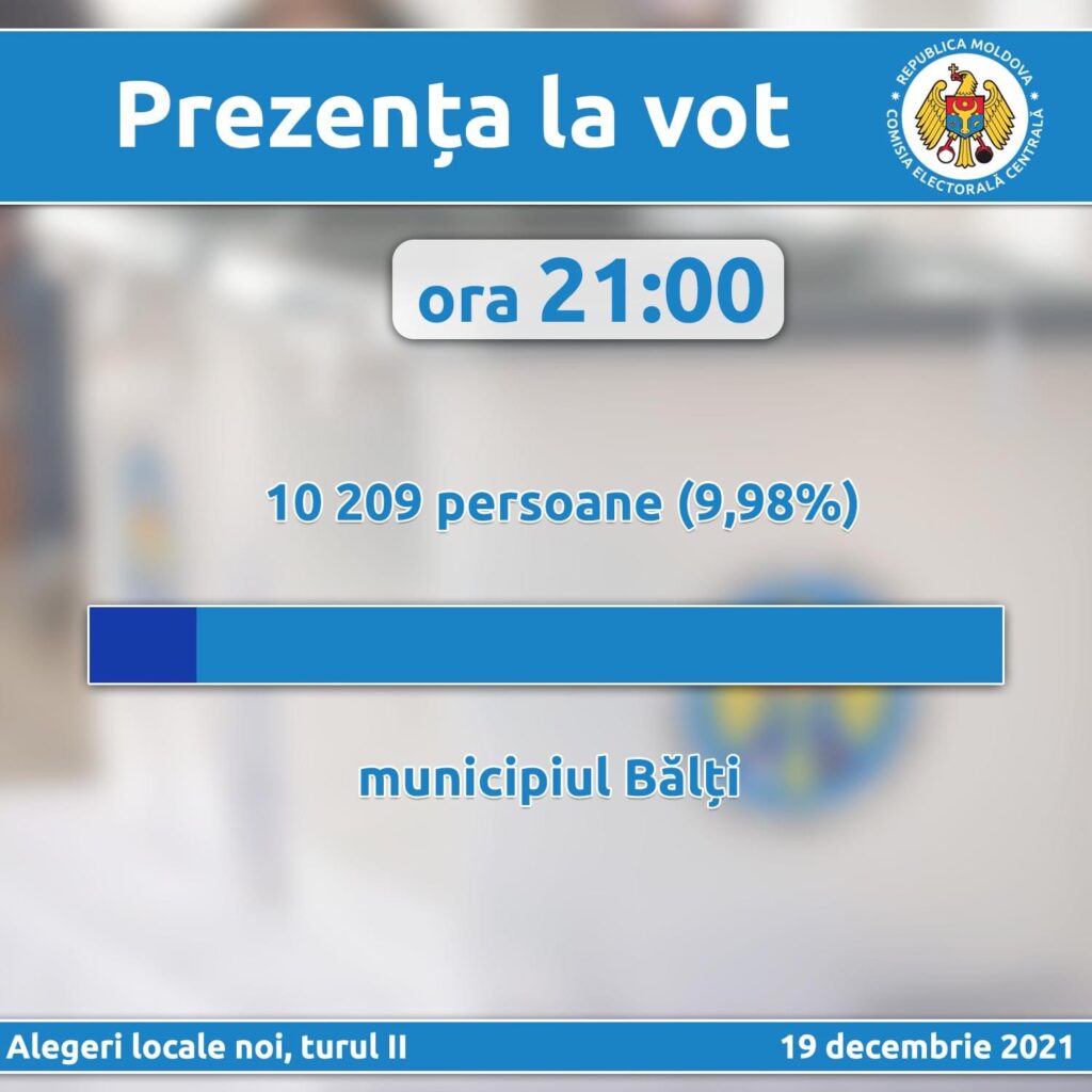 Comisia Electorală Centrală anunță că birourile electorale ale secțiilor de votare au încheiat procesul de numărare a voturilor și prezintă rezultatele preliminare ale turului doi al alegerilor locale noi pentru funcția de primar în municipiul Bălți.