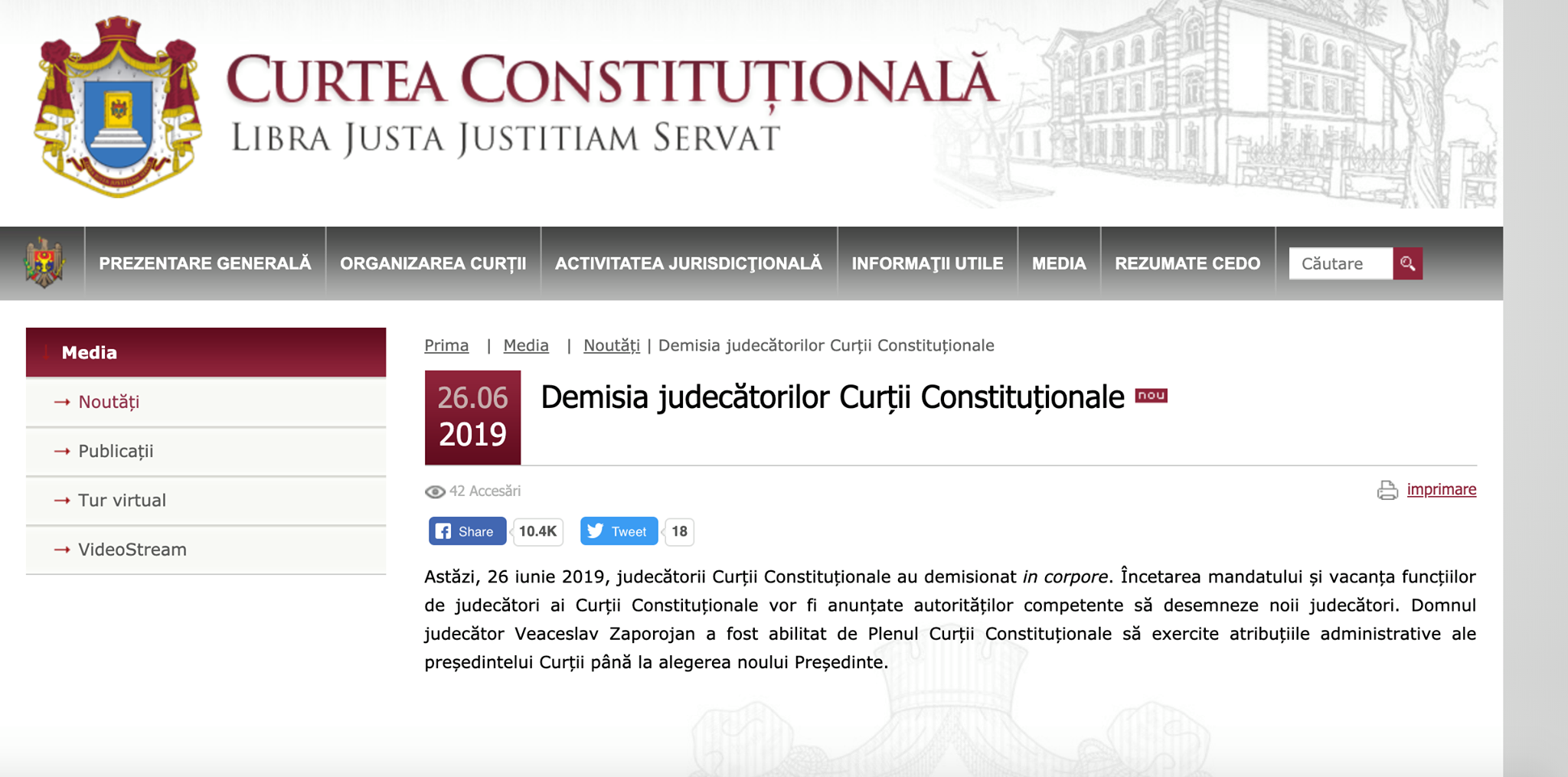 A fost publicat un comunicat oficial care anunță că judecătorii Curții Constituționale au demisionat in corpore. Veaceslav Zaporojan a fost abilitat să exercite atribuțiile administrative ale președintelui Curții până la alegerea noului președinte.