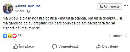 Fostul deputat al PCRM și delegat al Republicii Moldova la ONU, Alexei Tulbure, care în momentul de față se poziționează ca activist civic, a pus toți politicienii într-o oală și a scris pe profilul său de Facebook, că atât stânga cât și dreapta politică din țară sunt inutile și de la o vreme este de acord cu cei care spun că ce are să dispară, trebuie să dispară cât mai repede.