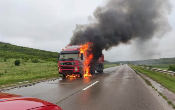 Un autocamion a luat foc în Rădeni