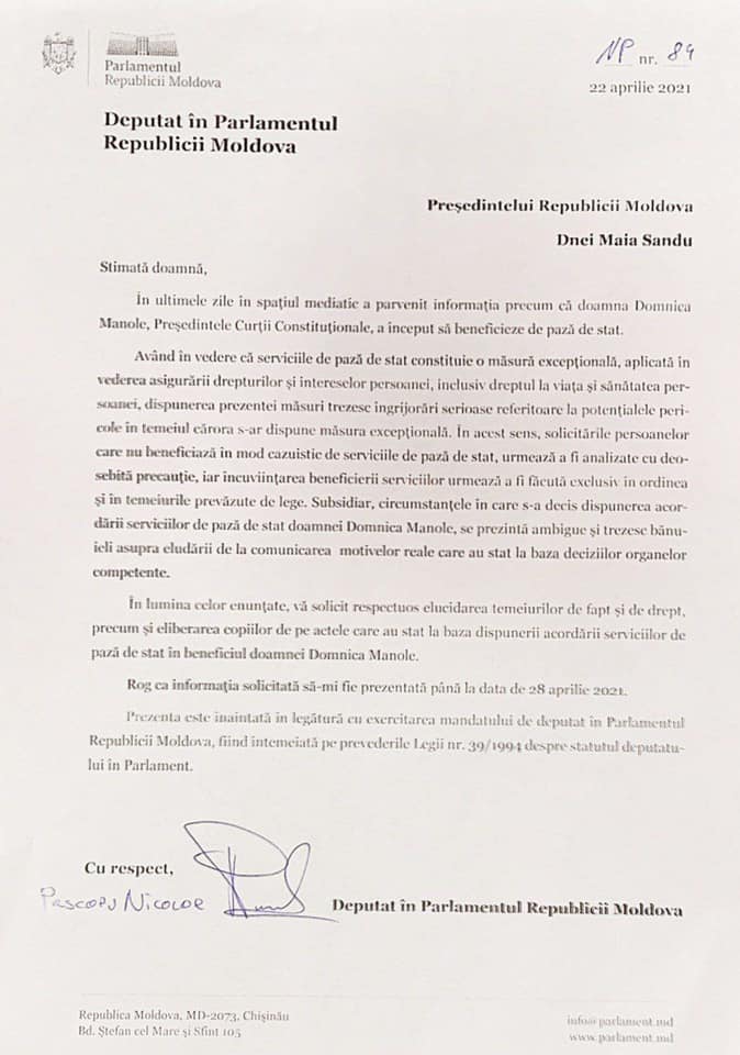 “Cu un salariu de 45 de mii de lei, o pensie de 21 de mii de lei, afaceri și proprietăți de milioane, președintele Curții Constituționale, Domnica Manole a cerut și pază de stat plătită de către cetățeni. A cerut pentru că i s-a năzărit că ar fi urmărită de persoane necunoscute. Maia Sandu imediat a dat indicații la SPPS să i se ofere paza de stat, dar se pare că au fost încălcate normele legale în luarea acestei decizii. Anume de aceasta, am depus astăzi două interpelări către Președinție și Serviciul Protecție și Pază de stat, în care am cerut să fiu informat, până în 28 aprilie, în baza căror temei de fapt și de drept a fost oferită paza de stat pentru Domnica Manole”, a scris Pascaru pe Facebook.