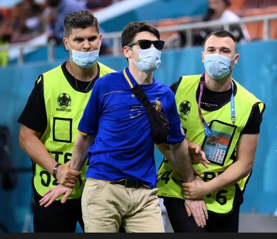 Presa de peste Prut scrie că bărbatul, îmbrăcat cu un tricou al naționalei Moldovei, a alergat pe teren în prima repriză a duelului de la București.