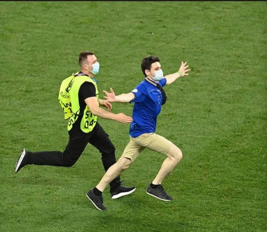 Acesta a fost pus la pământ de un steward, iar jocul a fost oprit pentru aproximativ un minut, jucătorii profitând de pauză pentru a se hidrata. Partida s-a reluat fără alte incidente.