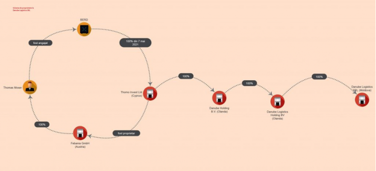 Din presă, aflăm despre structura complexă a companiilor din spatele Danube Logistics SRL, operatorul portului Giurgiulești. Danube Logistics SRL are în calitate de fondator compania olandeză Danube Logistics Holding BV. În spatele ei stă compania olandeză Danube Holding BV, iar aceasta, respectiv, are în spate o companie offshore în Cipru – Thomo Invest Ltd. Lanțul continuă cu Febania GmbH (Austria) și, în cele din urmă, apare proprietarul și beneficiarul final al companiilor – Thomas Moser, fostul mandatar al grupului de companii moldovenești, menționat anterior.