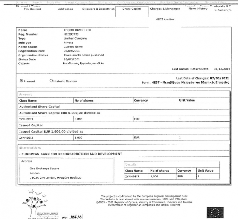 Din registrul oficial al întreprinderilor din Cipru, aflăm că într-adevăr pe data de 7 mai 2021, BERD a devenit noul proprietar al companiei Thomo Invest Ltd, iar suma tranzacției a constituit 1000 de Euro.