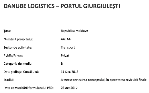 “BERD intenționează să acorde un împrumut garantat lui Danube Logistics SRL, întreprindere cu sediul în Republica Moldova, care deține și operează unicul port din țară, Portul International Liber Giurgiulești.