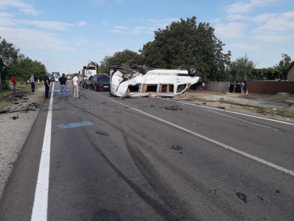 Un accident teribil s-a produs în această dimineață, cu implicarea a trei vehicule, duminică, 9 august, în apropiere de Ștefan Vodă. Un microbuz pe ruta Chișinău-Olănești s-a răsturnat, după ce a fost ciocnit violent de două vehicule. 11 persoane au fost transportate la spital, iar două dintre ele se află în stare gravă, scrie tv8.md