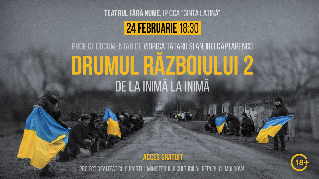 Pe 24 februarie, când se împlinesc patru ani de la începutul războiului din Ucraina, va avea loc premiera documentarului „Drumul Războiului 2: De la inimă la inimă”, realizat de jurnaliștii Viorica Tataru și Andrei Captarenco. Evenimentul este programat pentru ora 18:30, la Teatrul Fără Nume din Chișinău, pe strada Sfatul Țării 18.