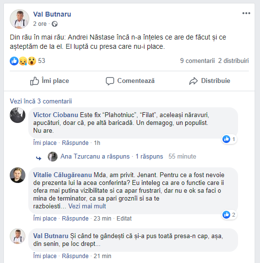 Opinia expusă pe facebook de Val Butnaru a fost încuviințată și de alți internauți în comentarii. „Este fix “Plahotniuc”, “Filat”, aceleași năravuri, apucături, doar că, pe altă baricadă. Un demagog, un populist.”, a comentat Victor Ciobanu.