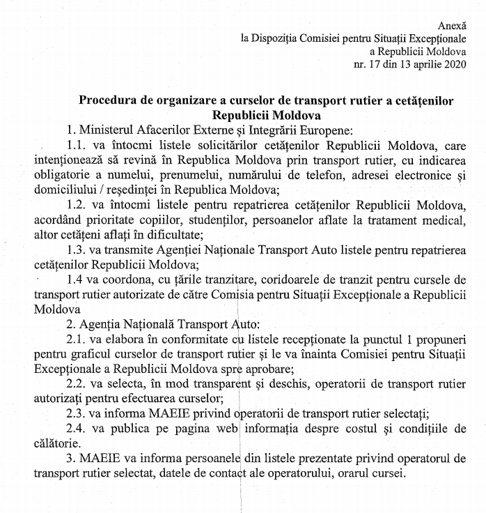 Prin aceeași dispoziție, s-a mai dispus că Agenția Națională Transport Auto va elabora în conformitate cu listele recepționate propuneri pentru graficul curselor de transport rutier și le va înainta Comisiei pentru Situații Excepționale a Republicii Moldova spre aprobare.