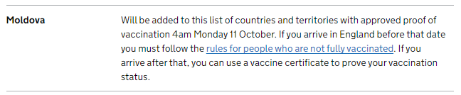 După 11 octombrie, călătorii care dețin un certificat de vaccinare moldovenesc trebuie să prezinte la intrarea în Marea Britanie următoarele: dovada rezervării unui test COVID care urmează să fie efectuat în a doua zi de la sosire, și formularul passenger locator form.
