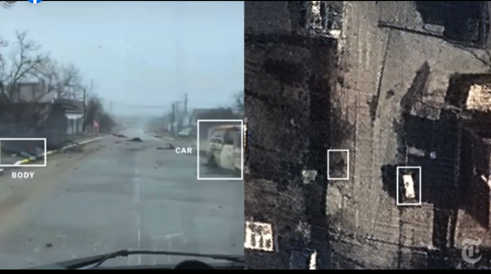 Astfel, se demonstrează că apariția persoanele decedate pe străzile din Bucea coincide cu data sosirii trupelor ruse în oraș. Imaginile din stânga ecranului sunt din 1 aprilie, filmate de un localnic după plecarea militarilor trimiși de Putin. Aceasta este dovada că timp de trei săptămâni, corpurile oamenilor omorâți au stat în aceeași poziție, iar teoria lansată de Rusia este o dezinformare marca Kremlin.