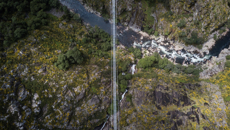 Ascuns între munți, în interiorul Geoparcului Arouca, din patrimoniul UNESCO, podul de 516 metri lungime este suspendat la 175 de metri deasupra răului Paiva.