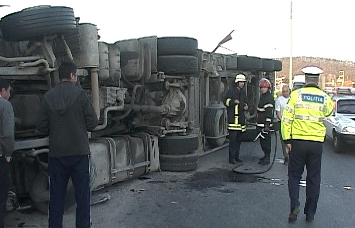 Şoferul unui TIR plin cu balast a pierdut controlul volanului şi s-a răsturnat într-o curbă. Din fericire, nimeni nu s-a aflat în acel moment în calea mastodontului, însă în urmă a lăsat prăpăd. Autobasculnata a avariat un autoturism de pe marginea drumului, iar cele 30 de tone de balast s-au răsturnat peste un gard şi l-au distrus, scrie presa din România.