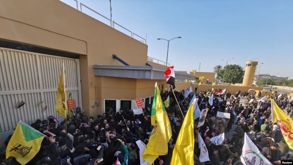 Sute de protestatari au încercat să pătrundă cu forța în ambasada SUA din Bagdad, după atacuri aeriene americane care au vizat gruparea paramilitară Kataeb Hezbollah, susținută de Iran. Atacul a survenit ca urmare a morții unui contractor american, în timpul unui atac cu rachete executat de gruparea respectivă împotriva unei baze militare irakiene.