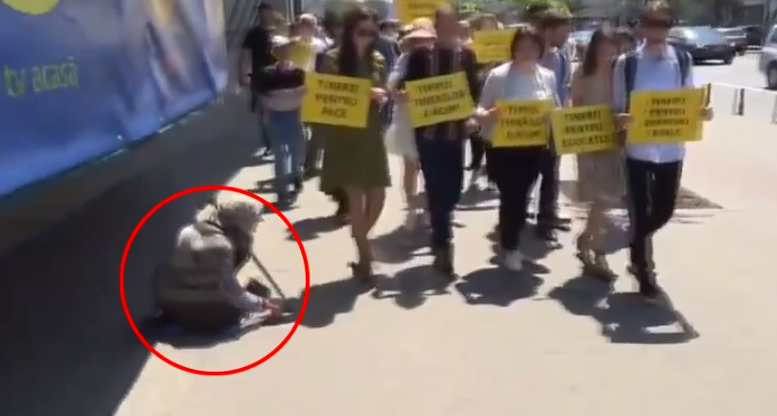 S-a întâmplat azi, 1 iunie, în centrul capitalei, în timpul Marșului tinerilor PAS. Din video se vede cum participanții la marș înconjoară bătrâna, iar premierul doar i-a tras o privire și a mers mai departe.