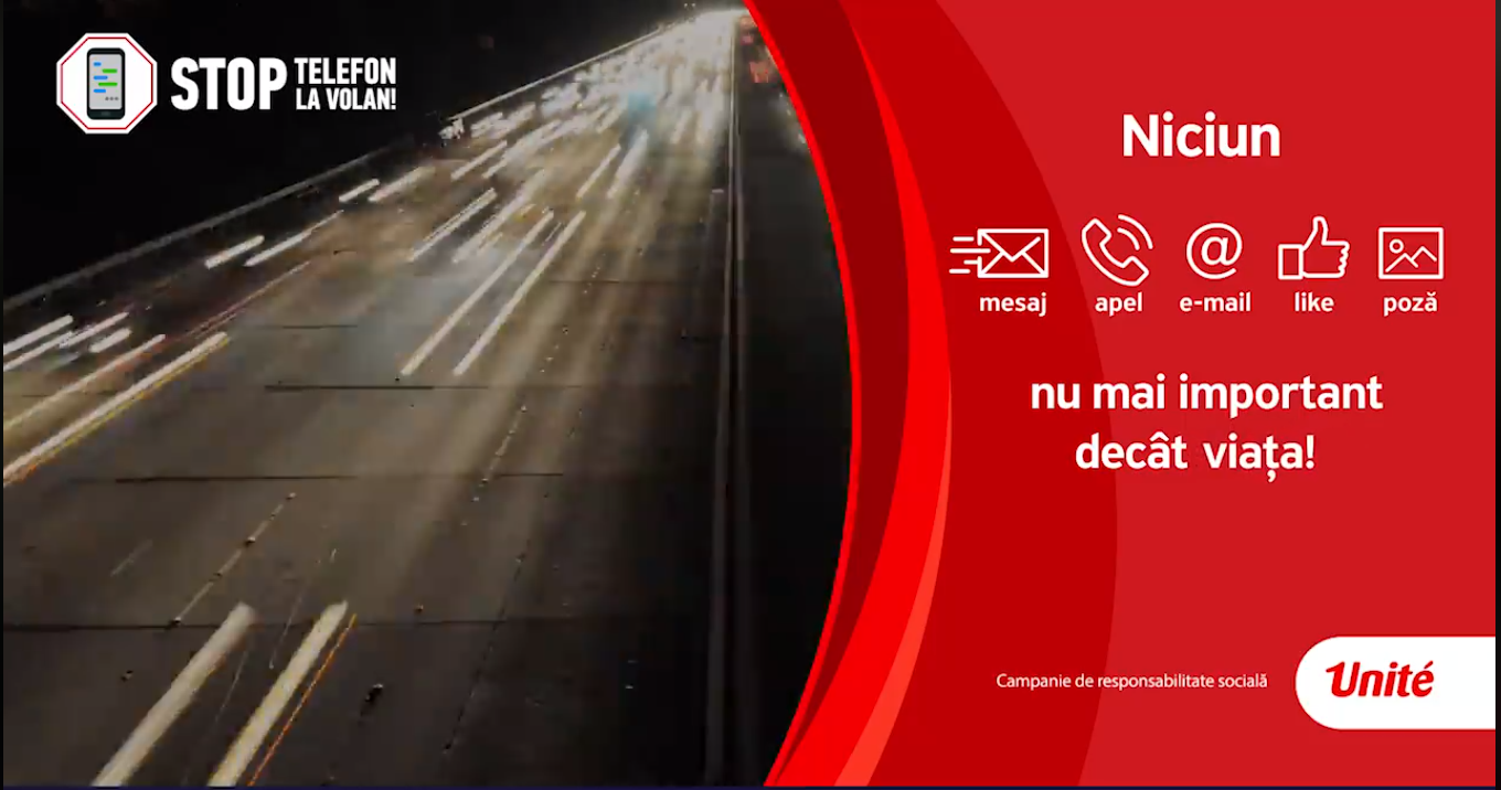 Sloganul companiei lansate de Unite este „Stop telefon la volan, nici un mesaj nu este mai important decât viața”.