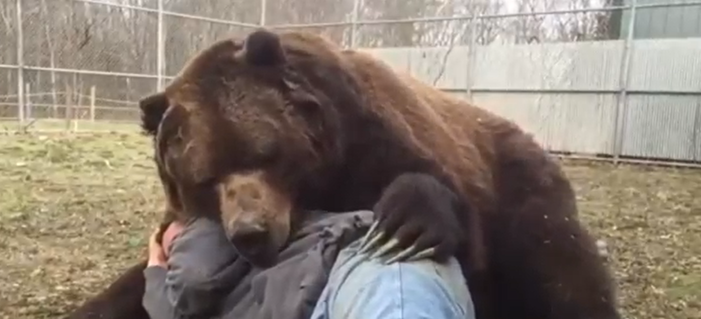 Fiind crescut în acest loc de la cea mai fragedă vârstă, ursul a devenit atât de prietenos, încât îl îmbrăţişează şi îl alintă pe pe Jim cu o dragoste fără margini. Nu se poate să nu fim înduioşaţi de aceste imagini emoţionante pe care rar le putem vedea. E uimitor cum instinctul feroce al unor animale poate fi transformat în atâta dragoste, sensibilitate şi blândeţe!