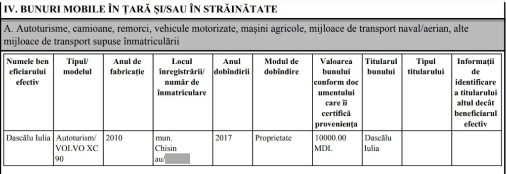 Deputatul PAS, Iulia Dascălu, recunoaște că a depus informații neveridice în declarația de avere pentru anul 2020. Mai exact, în document parlamentarul a indicat că deține un automobil VOLVO XC 90, fabricat în 2010, care ar fi fost procurat cu doar 10 mii de lei. Reporterii TV8 au întrebat deputatul PAS cum a fost posibil să procure o astfel de mașină la un preț atât de mic. Iulia Dascălu a recunoscut că mașina de fapt a costat-o 17 mii de euro, echivalentul a 340 de mii de lei.